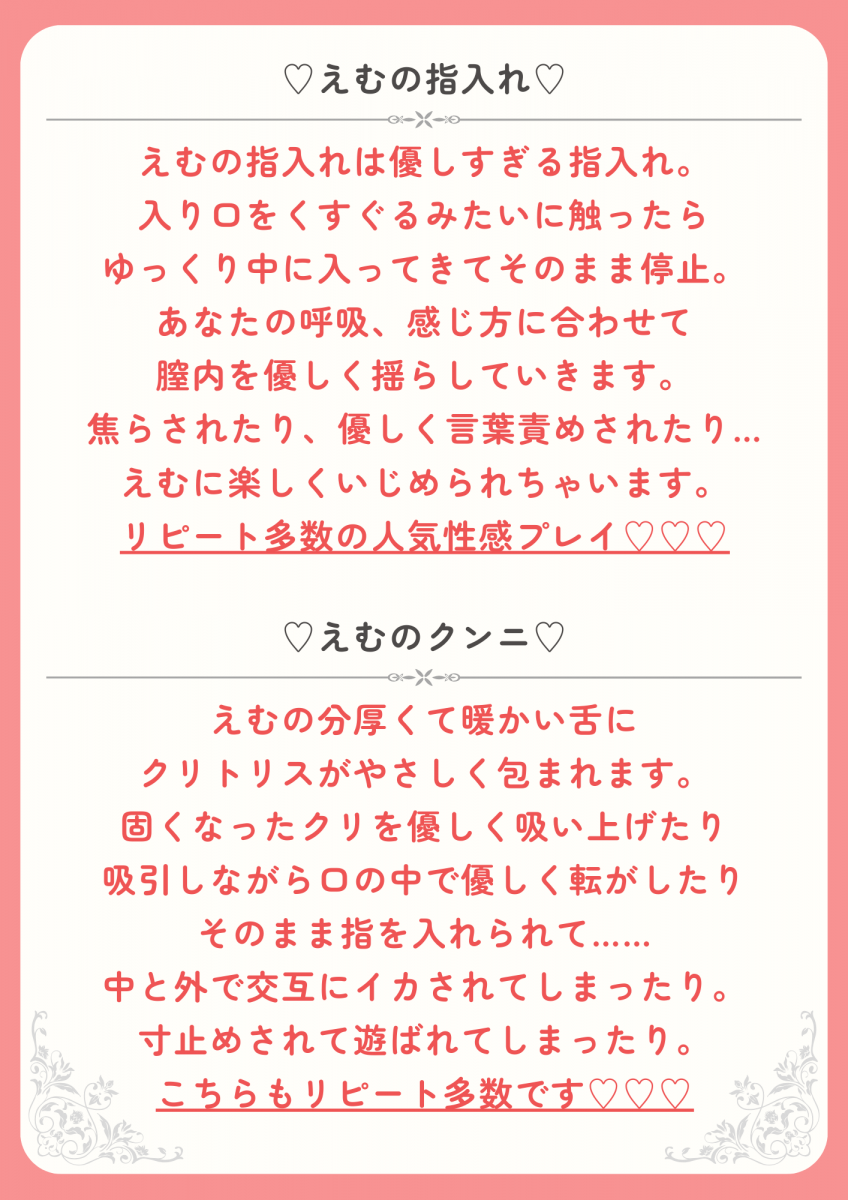 普段あまりイった事が無く、前戯も含めて男性経験もなかった事に悩んでました。今回、気持ちよくなりたいという気持ちが我慢できず利用しましたが、エスさんはとても優しくいじわるに、そしていちゃ甘な感じで良かったです!