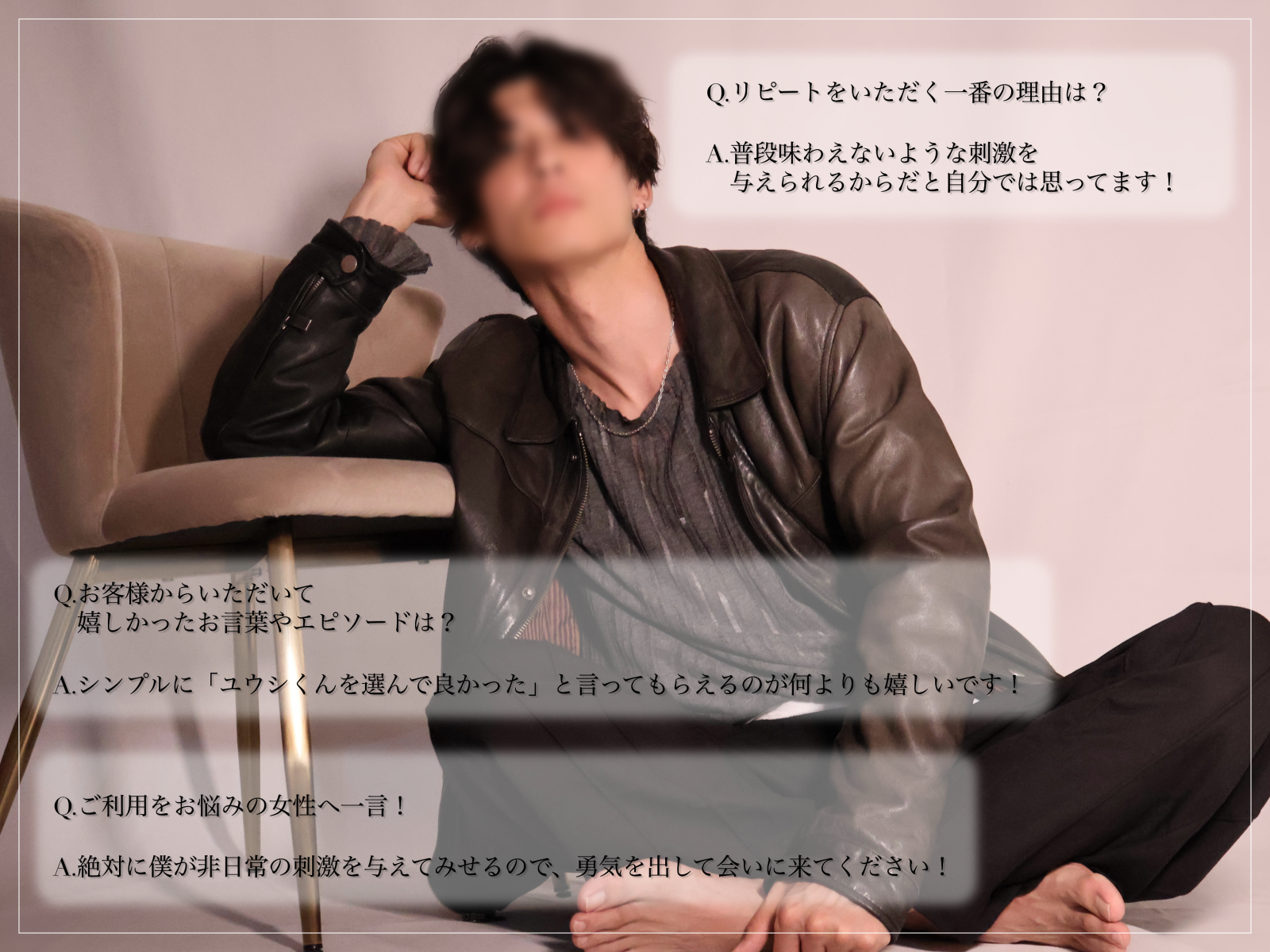 HPで見てかっこいい…となって、キャスを見てかっこいい…となって、かっこよすぎて緊張するだろうなと思ってずっとずっと予約できていませんでした。今回ついに予約できましたが、やっぱりめちゃくちゃかっこいいお方でした。