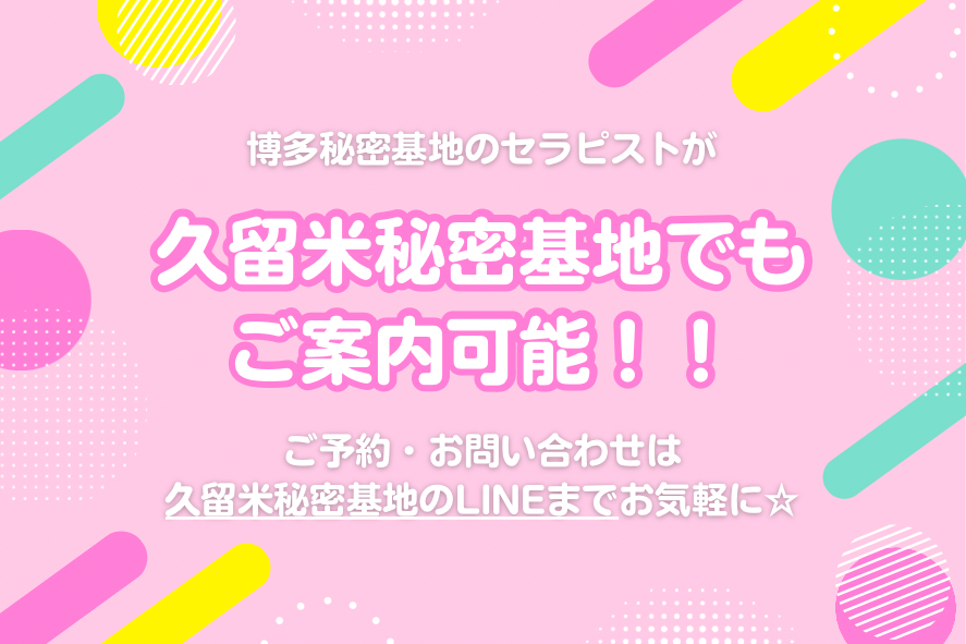 博多秘密基地のセラピストが久留米秘密基地でもご案内可能です♪